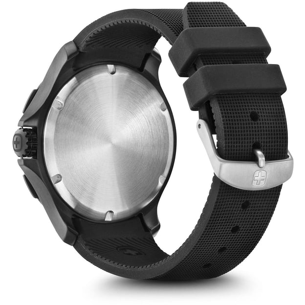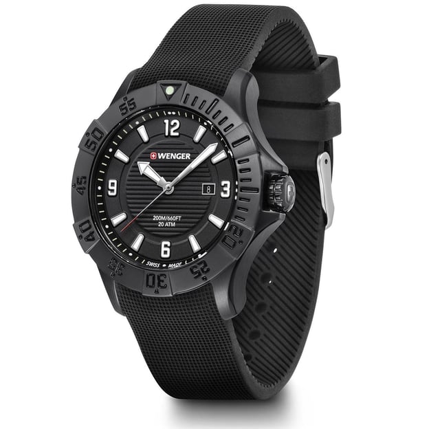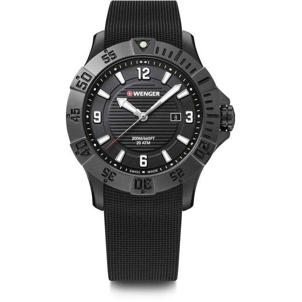Функціональна модель з апертурою дати в положенні "3 години" та чорним рухомим безелем, який можна використовувати для вимірювання часу занурення. Виразний чорний циферблат з чіткими маркерами значно спрощує зчитування часу. Великі світлонакопичувальні стрілки та годинні мітки з покриттям SuperLuminova®, які світиться у темряві. Конструкція із загвинчуванням заводної головки додатково перешкоджає проникненню вологи всередину корпусу під час занурень. М'який силіконовий ремінець з фактурною поверхнею перешкоджає прилипанню ремінця до руки. Високий клас водонепроникності до 20 АТМ дає можливість займатися дайвінгом, плаванням та іншими водними видами спорту. Від дошки для серфінгу до зали засідань - цей годинник обов'язково викличе фурор.