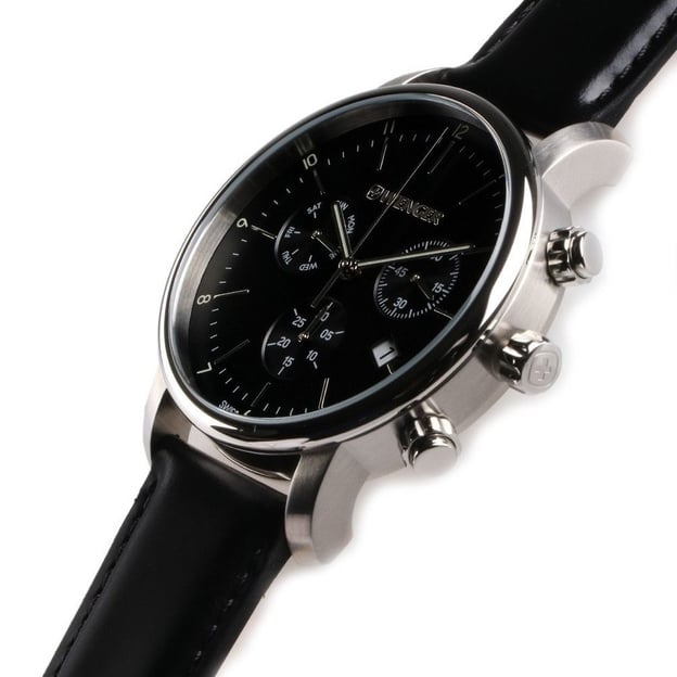 Швейцарський годинник Wenger URBAN CLASSIC Chrono 44 мм з хронографом, датою та днем тижня, створений для чоловіків, які цінують функціональність і стиль. Масивний корпус із неіржавної сталі діаметром 44 мм гармонійно поєднується з чорним ремінцем із натуральної шкіри. Великий чорний циферблат із подовженими маркерами та арабськими цифрами забезпечує легке зчитування часу, а люмінесцентне покриття SuperLuminova на стрілках гарантує видимість у темряві.