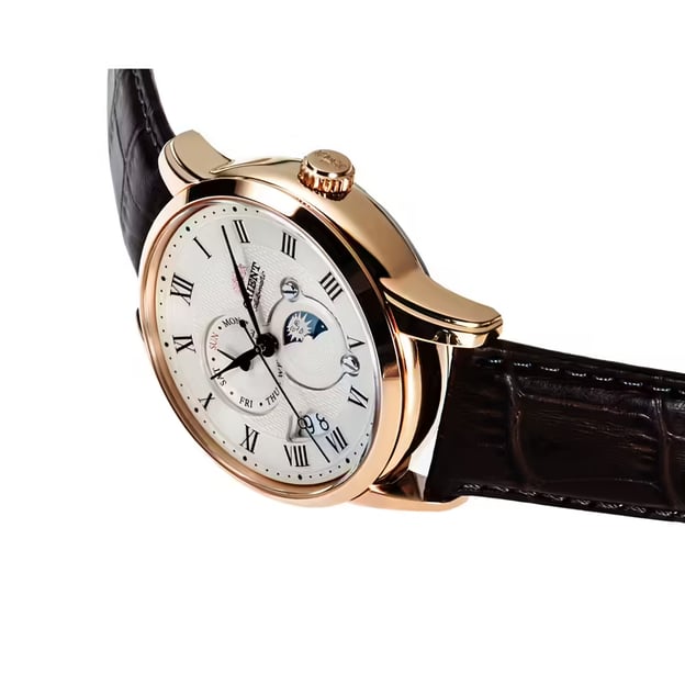 Orient SUN & MOON RA-AK0007S10B — чоловічий класичний годинник з бежевим циферблатом, який виглядає стримано та легко читається. Відображення день-ніч додає функціональності моделі, а індикація дати та дня тижня допомагає швидко зорієнтуватися в повсякденних справах.