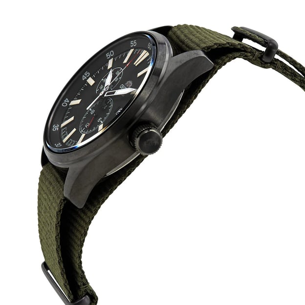 Чорний круглий корпус із неіржавної сталі поєднано з чорним циферблатом, а зелений текстильний ремінець годинника виглядає стримано й сучасно. Мінеральне скло стійке до ударів і подряпин, а люмінесцентні стрілки та мітки допомагають зчитувати час при слабкому освітленні. Діаметр корпуса — 42 мм.