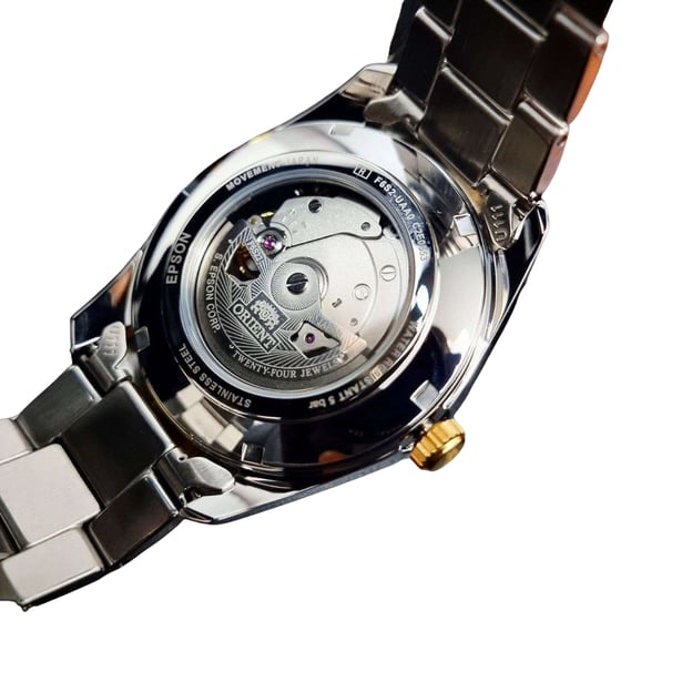 Усередині встановлений автоматичний механізм з аналоговою індикацією. Люмінесцентні стрілки та мітки полегшують зчитування часу при слабкому освітленні. Браслет із неіржавної сталі у двоколірному виконанні підкреслює загальну естетику моделі, а водозахист 5 ATM (50 м) додає впевненості в повсякденних ситуаціях при контакті з водою.