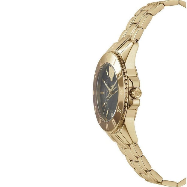 Як для жіночої моделі, корпус є досить великим, тому від вибору цієї моделі варто утриматися власницям тонкого зап'ястка. Фіксований безель доповнений назвою бренду. Золотистий сталевий дизайн випромінює розкіш і містить мінеральне скло, що забезпечує додатковий захист від подряпин і зовнішніх впливів. Модель оснащена точним кварцовим механізмом, що забезпечує надійне відображення часу. А завдяки водонепроникності 5 АТМ вам не доведеться турбуватися про дощ або бризки води.