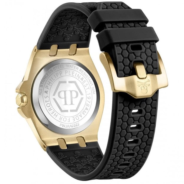 Philipp Plein Extreme Lady PWJAA0322 — жіночий годинник з виразним контрастом: круглий корпус у золотистому тоні та чорний циферблат. Чорний силіконовий ремінець м’яко сидить на зап’ясті, не боїться щоденного використання та легко поєднується з різним одягом.