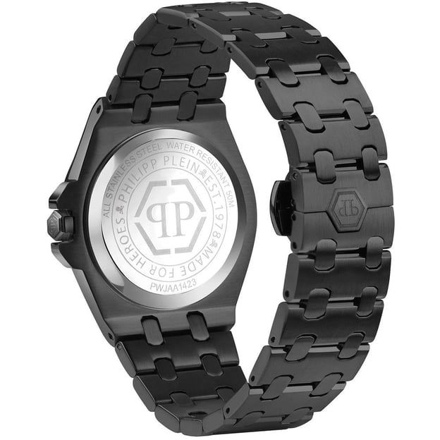Вишуканий годинник з середнім сталевим корпусом 38 мм. В основі цього годинника лежить японський кварцовий механізм, гарантує точне вимірювання часу і забезпечує наступні функції: години, хвилини, секунди. Дивовижний браслет з цікавим дизайном ланок і застібкою-метеликом, яка використовується у преміальних годинниках, принесе вам додаткове задоволення від нового годинника Philipp Plein. Забезпечує високий рівень комфорту при носінні та елегантний вигляд на зап'ястку.