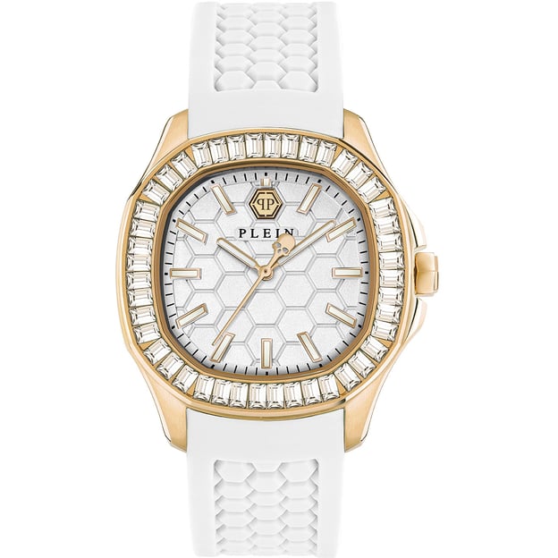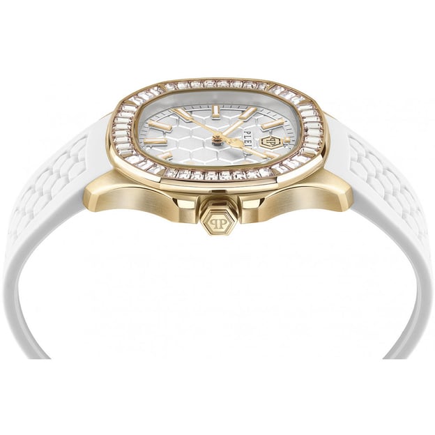 Philipp Plein The $pectre Lady (PWTAA0924) — жіночий годинник з виразним поєднанням золотистого круглого корпуса та білого циферблата. Білий силіконовий ремінець м’яко сидить на зап’ясті й добре підходить для щоденного носіння, а кварцовий механізм забезпечує точний і невибагливий у догляді хід.