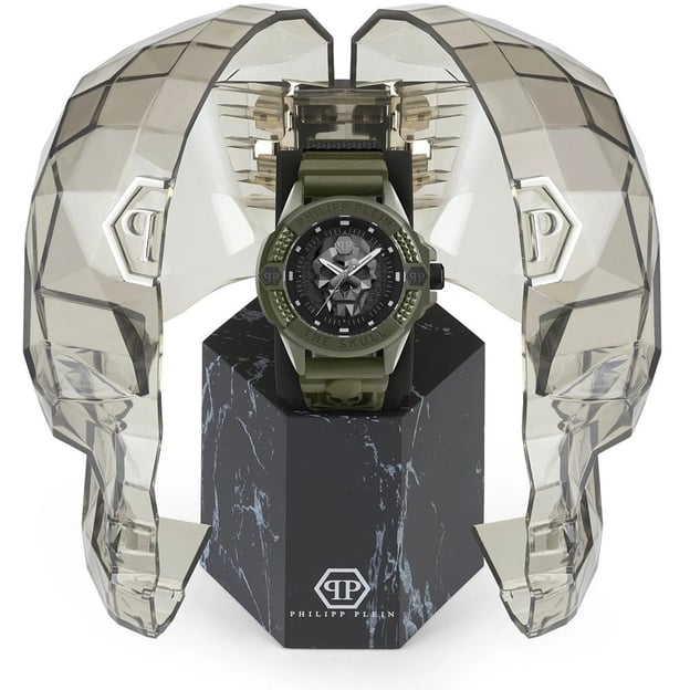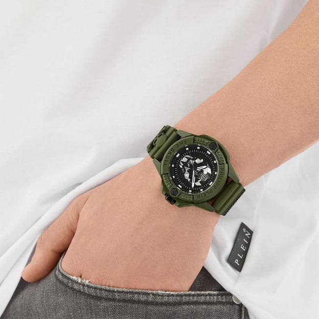 Philipp Plein The $kull Ecoceramic (PWUBA0423) — чоловічий годинник з круглим корпусом 44 мм із екокераміки. Зелений корпус і зелений силіконовий ремінець виглядають цілісно та сучасно, а чорний циферблат додає контрасту й робить індикацію більш зчитуваною. Мінеральне скло захищає циферблат від щоденних дрібних подряпин.