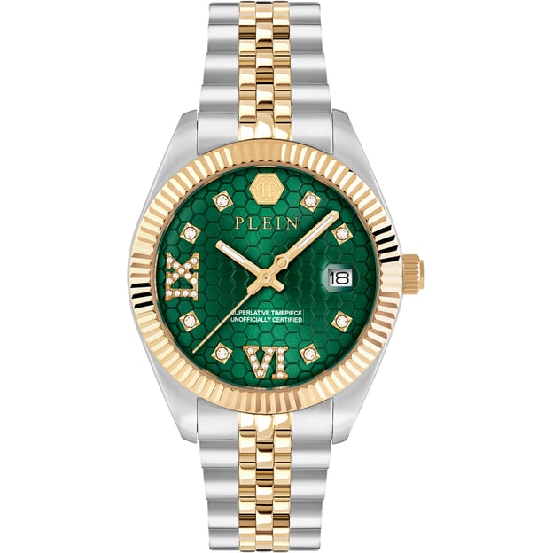 Жіночий годинник Philipp Plein Date Superlative PWYFA0225 поєднує виразний зелений циферблат з круглим корпусом діаметром 34 мм. Сталево-золоте оформлення корпуса та браслета виглядає елегантно та гармонійно, а аналогова індикація чітка й зручна для швидкого зчитування часу.