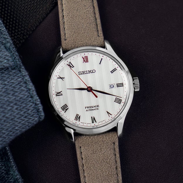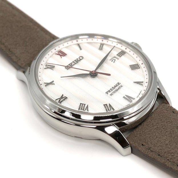 Seiko SRPG25J1 - японський автоматичний годинник Presage Japanese Garden з білим шевронним циферблатом і коричневим замшевим ремінцем. Елітна модель 2021 року. Текстурований циферблат, натхненний японським дзен-садом. На основі чудової японської годинникової справи, кожна модель Presage відображає суть унікального сприйняття краси, природи та мистецтва.
