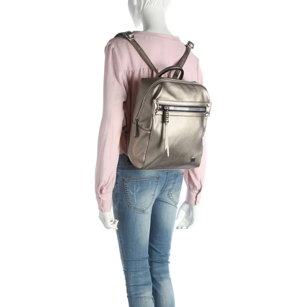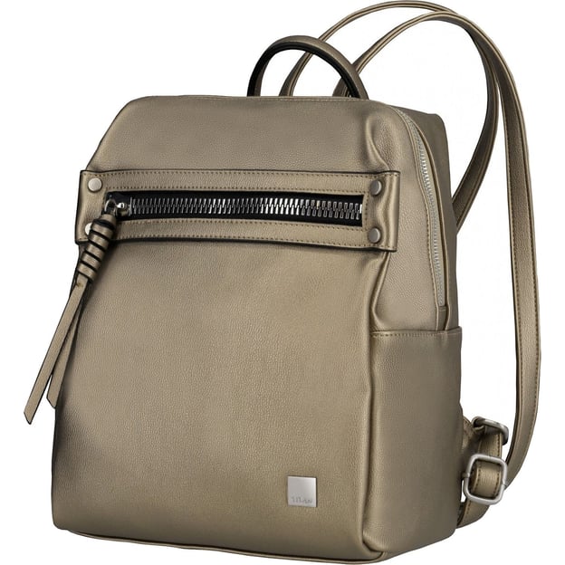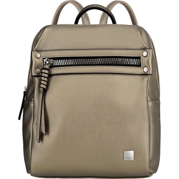 Titan SPOTLIGHT SOFT/Metallic Gold (26x30x15см / 11 л / золотий металік) - стильний жіночий рюкзак із металічним блиском, що надає йому сучасного та модного стилю. Модель створена у рамках співпраці з популярним реаліті-шоу Next Topmodel у Німеччині. Легкий та невеликий рюкзак на тонких плечових ременях ідеально підійде для міських прогулянок або відпочинку. Аксесуар виготовлено з високоякісного поліуретану, що надає йому сучасного вигляду з металевим блиском. Цей матеріал не тільки має стильний вигляд, а й забезпечує довговічність і стійкість до несприятливих погодних умов. Основне відділення просторе і зручне для зберігання книжок, документів, одягу та інших необхідних речей. Усередині основного відділення розташована одна кишеня на блискавці та дві кишені відкритого типу, які допомагають підтримувати порядок і легко знаходити потрібні предмети. Фронтальна і невелика задня кишені на блискавці зручні для зберігання дрібних предметів, таких як ключі, телефон або гаманець, забезпечуючи швидкий доступ до них.