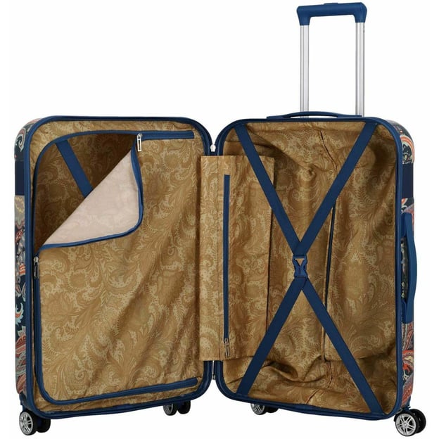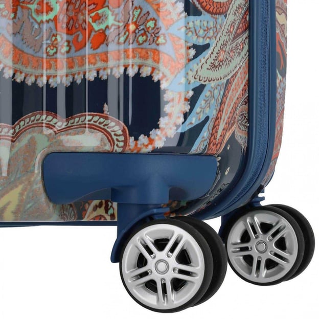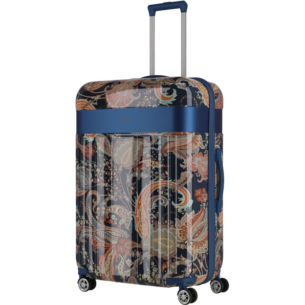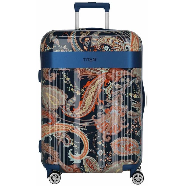 Titan SPOTLIGHT FLASH/Paisley Blue Велика (51 x 76 x 30 см / 102 л / синя з візерунком) - велика німецька валіза в ефектному дизайні з унікальним орнаментом для довготривалих подорожей. Валіза виготовлена з міцного жорсткого ABS-корпусу з полікарбонатною плівкою. Це робить валізу ще більш пружною і добре захищеною від пошкоджень. Багатий глянцевий блиск поверхні надає валізі унікальний вигляд. Водонепроникна блискавка та кодовий TSA-замок відповідають за безпеку ваших особистих речей у дорозі та на митниці. Міцна і витривала 4-х колісна система подвійних коліс на металевих підшипниках з радіусом обертання на 360 градусів, завдяки чому валіза дуже зручна у використанні.