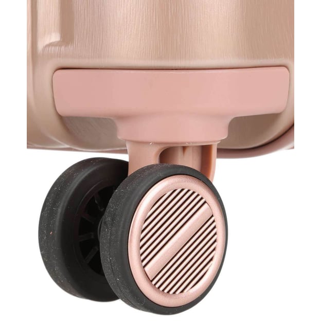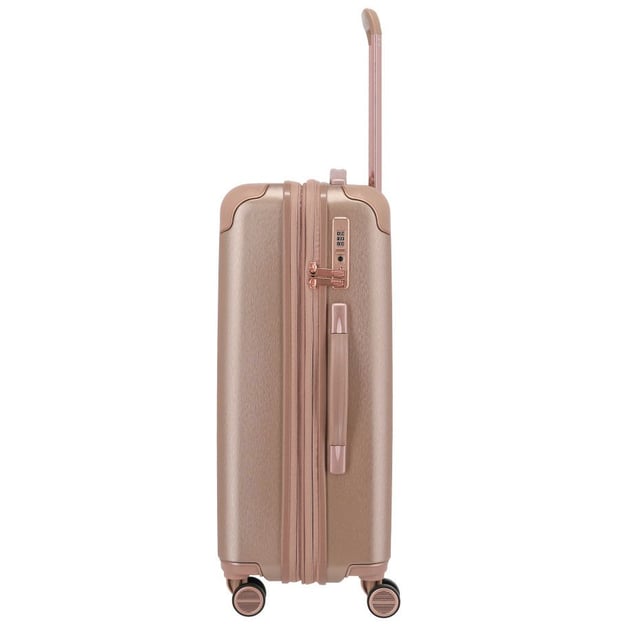 Titan BARBARA GLINT/Rose Metallic Середня (45 x 67 x 26 см / 68 л / колір рожевого золота) - жіноча валіза середнього розміру в ексклюзивному дизайні кольору рожевого золота. Гламурний дизайн моделі ексклюзивно розроблений у співпраці з журналом BARBARA та телеведучою Барбарою Шенебергер. Корпус із полікарбонату чудово витримує удари та падіння під час транспортування. Оздоблення металік надає вишуканості зовнішньому вигляду. Внутрішній простір пропонує популярний функціонал для акуратного пакування речей. У вас завжди буде місце для шопінгу завдяки вставці розширення об'єму на 10 л. Кодовий замок із функцією TSA подбає про додаткову безпеку вашого багажу. Для максимально комфортного пересування валіза оснащена 4 подвійними колесами з тихим ходом.