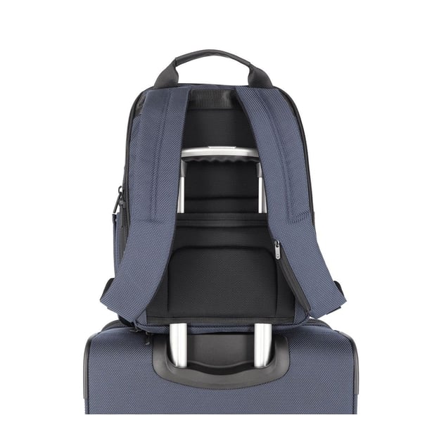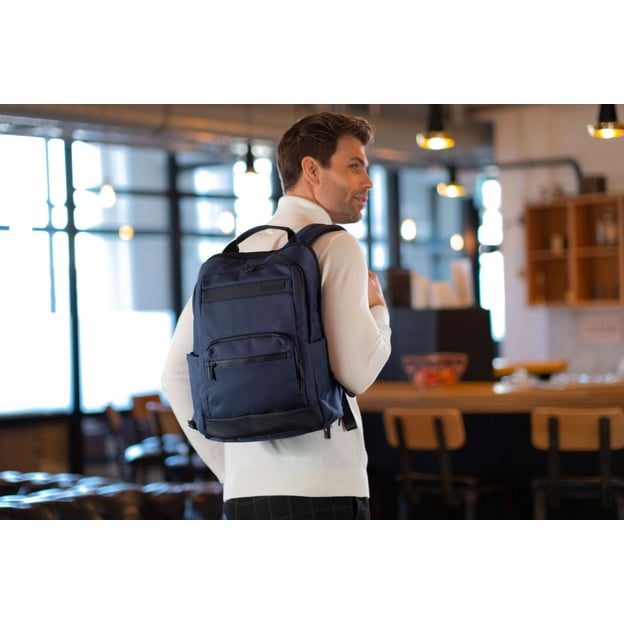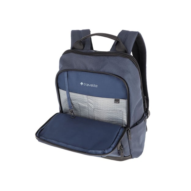 Travelite MEET/Navy (30x41x14см / 17 л / темно-синій) - німецький рюкзак для ноутбука з функцією розширення від бренду Travelite. Зручна і функціональна модель підходить для навчання, роботи, відряджень та подорожей. Лаконічний і сучасний дизайн, підійде як для ділового стилю, так і для повсякденного використання. Модель розроблена з урахуванням усіх необхідних аспектів для зручного та безпечного зберігання речей, документів та портативної електроніки. Практичний матеріал виробу із поліестеру практично не вбирає вологу, швидко сохне, не розтягується і тримає форму. Основне відділення з двома м'якими кишенями, які підходять для пристроїв з діагоналлю до 11 і 15,6 дюймів, також є внутрішня кишеня на блискавці. На лицьовій стороні рюкзака розташовано дві невеликі кишені на блискавці для швидкого доступу до речей першої необхідності. У відділенні-органайзері з RFID-захистом є два тримача для ручок, дві кишені для дрібниць і карабін для ключів. При необхідності параметри моделі можна відрегулювати за допомогою вставки на блискавці.