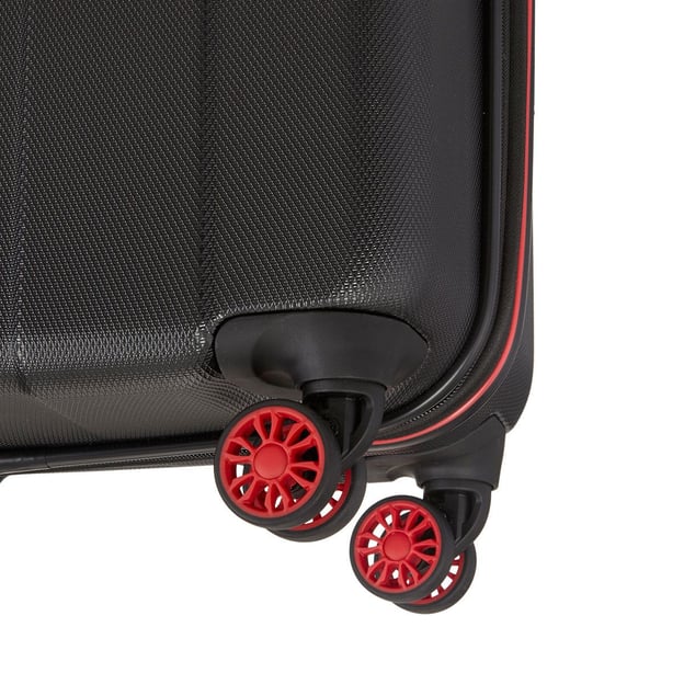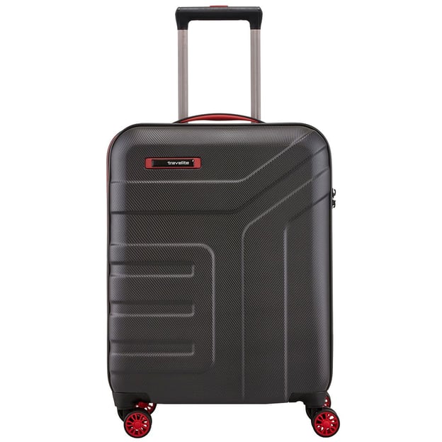 Travelite VECTOR Black S (чорна; 40 літрів) - стильна валіза на 4 колесах для коротких поїздок з невеликою кількістю речей. Параметри валізи відповідають ручній поклажі для більшості авіакомпаній. Структурована поверхня чорного кольору з контрастними червоними акцентами. Захопливі поєднання кольорів роблять серію Vector по-справжньому привабливою. Поверхня виготовлена з міцного ABS-пластику, який стійкий до подряпин. Двокамерне відділення з тканинною підкладкою по всій площі та еластичними пакувальними ременями з додатковим гумовим покриттям для фіксації речей. Розділювач з трьома кишенями для білизни та різних дрібниць. Вбудований кодовий замок TSA - кращий захист вашого багажу. Чотири подвійні колеса Vector з обертанням на 360 градусів.