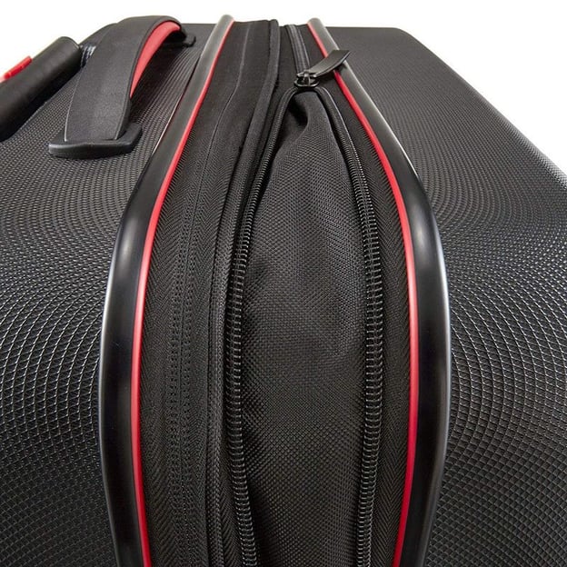 Валіза в футуристичному чорному дизайні з червоними акцентами. Поверхня виготовлена з удароміцного та жорсткого ABS-пластику. Двокамерне відділення з тканинною підкладкою із нейлону. Середній розмір валізи з функцією розширення об'єму на 12 л дозволить вам завжди взяти більше, ніж заплановано. Внутрішній простір пропонує акуратний поділ одягу, білизни та аксесуарів. В корпус вбудований замок кодового блокування TSA. М'які прогумовані ручки для перенесення валізи у горизонтальному та вертикальному положенні. Для стійкості в горизонтальному положенні є ніжки на бічній грані валізи.