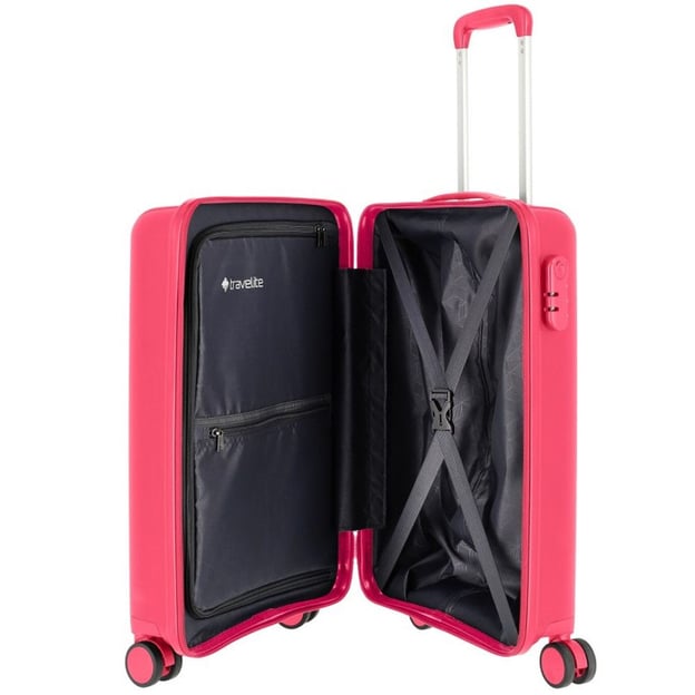Travelite VAKA TL076447 (поліпропілен / яскраво-рожева / Маленький розмір 55х37х20 см; 33 л) - 4-колісна валіза в твердому корпусі з кодовим замком. Стійка до подряпин та потертостей фактура зі стильним акцентом у вигляді вставки з назвою бренду. Практична конструкція на 4 колесах з подвійними роликами, які надають додаткової стійкості та маневреності валізі. Поїздки навіть з великою кількістю речей перетворюються на приємну пригоду.