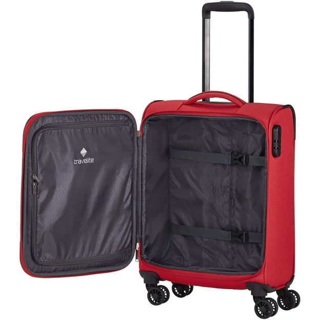 Travelite CHIOS TL080047 (поліестер / червона / 39x55x20 см / 34 л) - маленька валіза з якісного водонепроникного текстилю. Просторе та добре організоване місце для речей без зайвих наворотів. Створена для нетривалих поїздок вихідного дня та відряджень на 2-3 дні. Підходить для ручної поклажі на борту літака, що дозволяє уникнути додаткових витрат на реєстрацію багажу.
