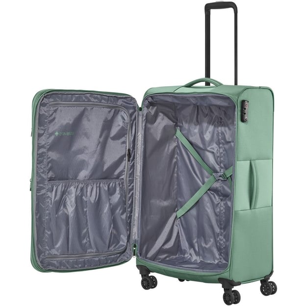 Travelite CROATIA TL080349 (поліестер / Mint / 47x77x30-34 см / 90-96 л) - велика валіза м'ятного кольору на 4 колесах із замком TSA та функцією розширення. Гарна місткість, легка вага і висока якість роблять цю валізу ідеальним компаньйоном для поїздок на довго і з великою кількістю речей, а завдяки додатковій можливості збільшити розмір, ви можете сміливо зібрати речі навіть у сімейну подорож з дітьми. Переднє відділення додасть комфорту та забезпечить швидкий доступ до найнеобхідніших у дорозі речей. Колекція також порадує різноманітністю кольорових дизайнів, що полегшить пошук вашої валізи на багажній стрічці.
