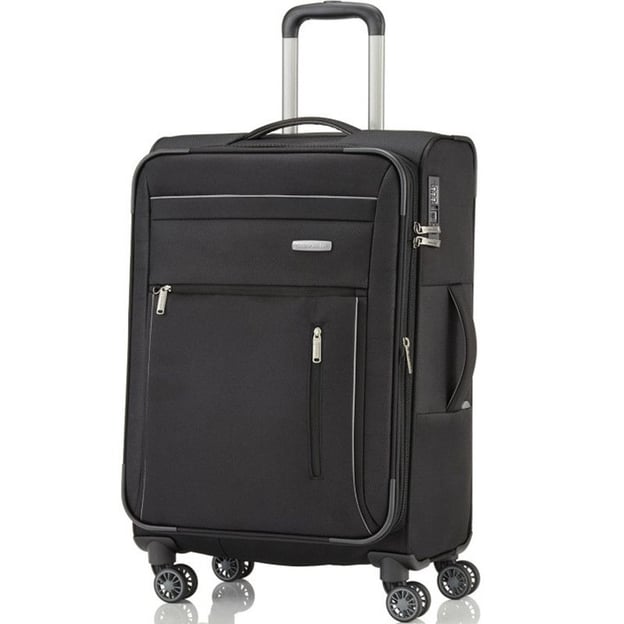 Travelite CAPRI TL089848 (поліестер / чорна / Середній розмір+ 66х42х26-30 см; 67-77 л) - текстильна валіза на 4 колесах з функцією розширення та вбудованим TSA замком. Допоможе організовано запакувати ваші речі для тижневої поїздки. Бездоганну маневреність на вокзалах та в аеропортах вам гарантують 4 колеса, що обертаються на 360 градусів. Завдяки додатковим зовнішнім кишеням ваші посадкові квитки, серветки, дорожня подушка або улюблена книга завжди у швидкому доступі.