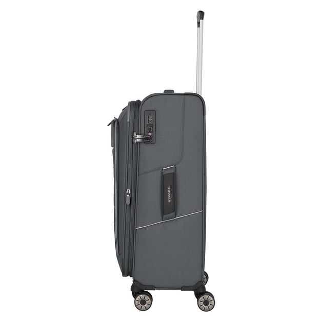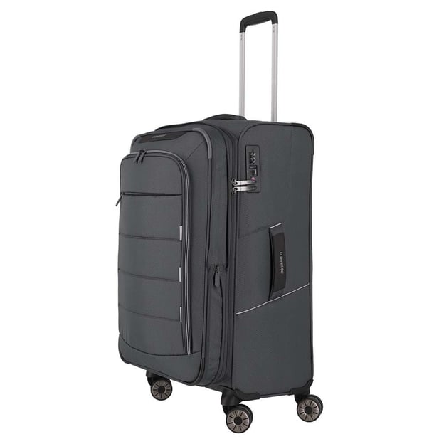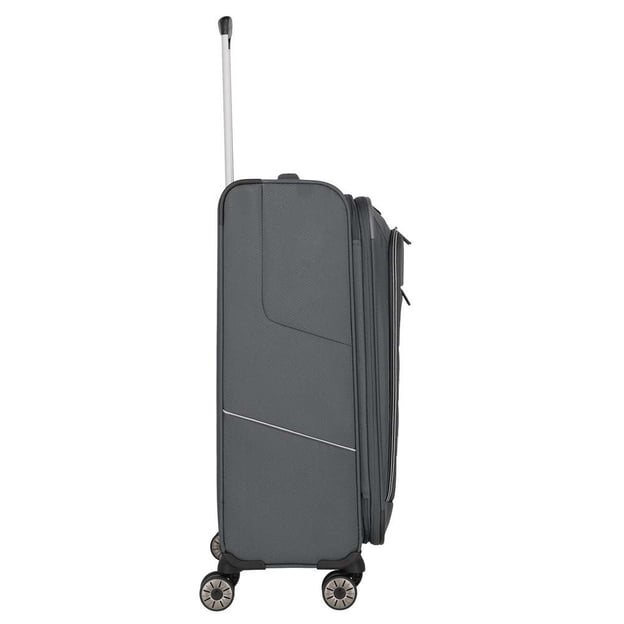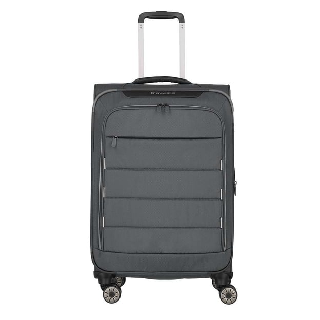 Travelite Skaii Anthracite M Середня (темно-сіра; 62 літри) - суперлегка валіза на 4 колесах для незабутніх подорожей від німецького бренду Travelite. Валіза з невеликою власною вагою робить подорожі більш комфортними. Колекція Skaii виготовлена з поліефірної тканини, отриманої із сертифікованих перероблених пластикових відходів. Таким чином, у цикл не потрапляє новий пластик.