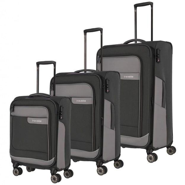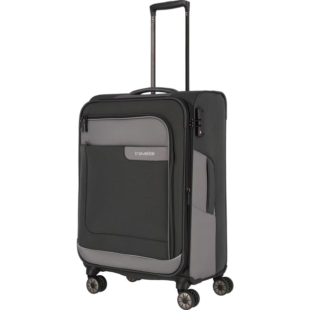 Travelite VIIA TL092848 (перероблений поліестер / темно-сіра / Середній розмір+ 67х44х29-33 см; 70-80 л) - текстильна валіза з екоматеріалу з можливістю розширення та кодовим замком TSA. Чотири подвійні колеса мають чудовий плавний хід і дозволяють вам елегантно пересуватися. А вставка-розширювач на блискавці швидко додасть місця для додаткового багажу.