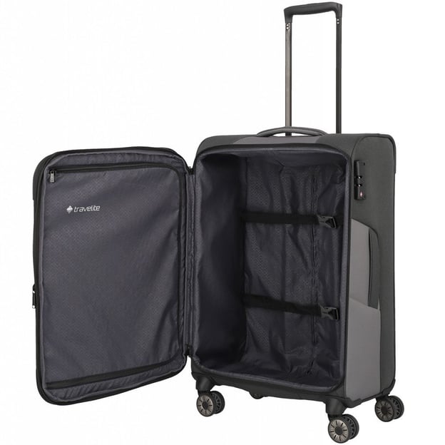 Travelite VIIA TL092849 (перероблений поліестер / темно-сіра / Великий розмір+ 77х47х30-34 см; 91-103 л) - якісна текстильна валіза з екоматеріалу з розширенням та кодовим замком TSA. Чотири подвійні колеса мають чудовий плавний хід і дозволяють вам елегантно пересуватися. А вставка-розширювач на блискавці швидко додасть місця для додаткового багажу.