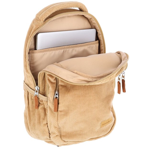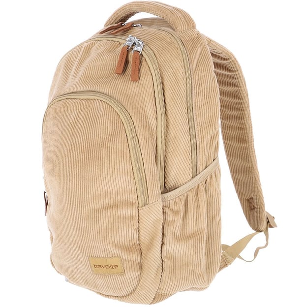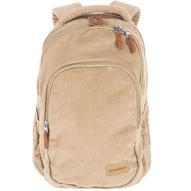Travelite Cord Beige (26x40x14 см / 13 л / бежевий) - вельветовий рюкзак на 13 літрів з кишенею для ноутбука до 13 дюймів від бренду Travelite. Модель доповнить будь-який ваш образ і стане справжнім компаньйоном на прогулянках або в поїздках. Рюкзак виконаний з міцного вельветового матеріалу, який має не тільки вишуканий вигляд, але й робить його приємним на дотик. Регульовані наплічні ремені та м'яка спинка забезпечать максимальний комфорт при носінні, а широка манжета дасть змогу легко закріпити рюкзак на ручці валізи, якщо ви подорожуєте з кількома одиницями багажу. Якісні блискавки та текстильна підкладка гарантують довговічність у використанні. Продуманий дизайн з двома відділеннями на блискавці. В основному відділенні є безпечна кишеня для ноутбука до 13 дюймів. Велика фронтальна кишеня-органайзер допоможе вам легко організувати дрібні речі, а дві бічні кишені нададуть місце для пляшки з водою, термоса або парасольки.