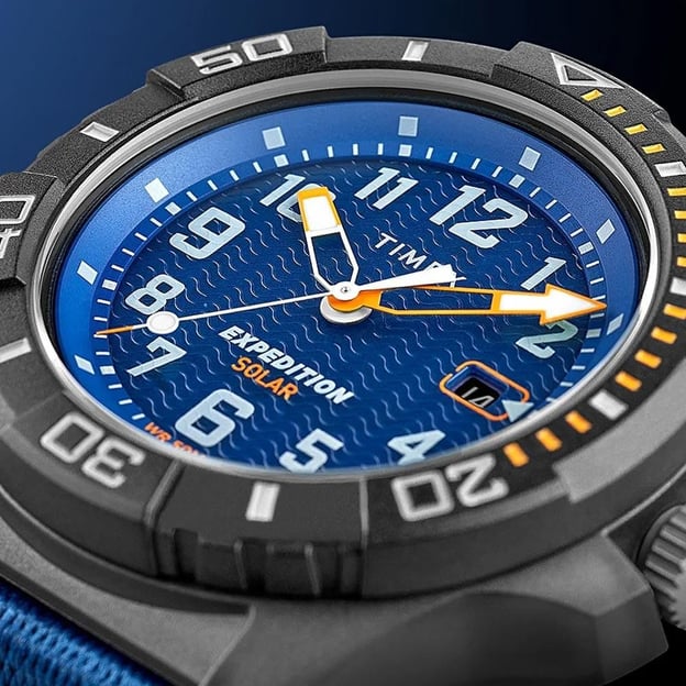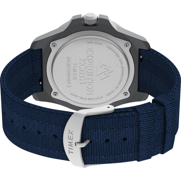 Чоловічий годинник Timex EXPEDITION North Freedive Ocean Solar Tx2v40300 - модель із сонячною батареєю та синім екоремінцем. Механізм на сонячній енергії, який працює до 4 місяців та усуває необхідність заміни батарейки. Виконаний в стилі дайверського годинника з односпрямованим безелем і міцним захистом заводної головки. Синій циферблат з апертурою дати, великими люмінесцентними стрілками та індексами, що додасть зручності при зчитуванні показань циферблату годинника в темний час доби та в умовах обмеженої видимості. Вирушаючи у ваш наступний похід або експедицію, не забудьте ваш EXPEDITION. Серія простих зовні, але продуманих до найменшої дрібниці годинників для шанувальників туризму, екстріму. Вдале поєднання міцності, точності, функціональності та комфорту.