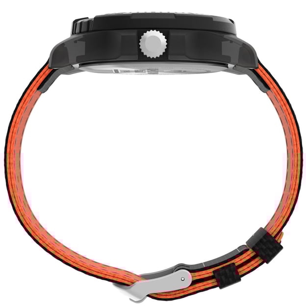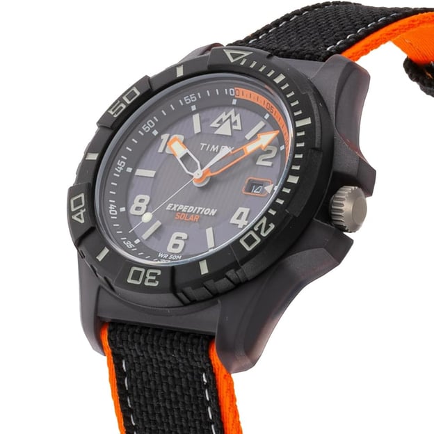 Чоловічий годинник Timex EXPEDITION North Freedive Ocean Solar Tx2v66100 - модель на сонячній батареї, з чорно-помаранчевим ремінцем з перероблених матеріалів. Виготовлено у співпраці з ініціативою #tide™ . Пластик збирають на береговій лінії, а потім відправляють до Швейцарії на транспорті з нейтральним викидом вуглецю для переробки, внаслідок чого виходить екологічно чистий матеріал преміум-класу. Виконаний в стилі дайверського годинника з односпрямованим безелем і міцним захистом заводної головки. Японський механізм на сонячній енергії, який усуває необхідність заміни батарей.