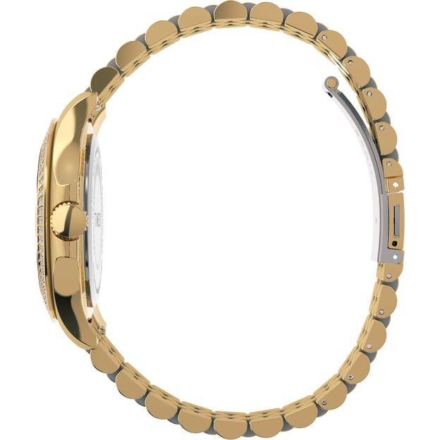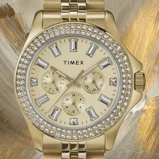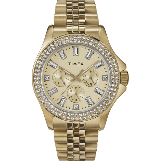 Жіночий мультизадачний годинник Timex KAIA Multifunction Tx2v79400 - модний та стильний годинник на золотистому сталевому браслеті з інкрустацією камінчиками на циферблаті та безелі. Багатофункціональна модель з трьома додатковими циферблатами: дата, день тижня, час у 24-годинному форматі. Завдяки декору цей годинник стане вашою улюбленою прикрасою. Дуже жіночна модель, але з більшим силуетом, ніж більшість жіночих годинників. Зухвалі та гламурні модниці, годинник KAIA створений для вас і чекає на момент, коли ви разом вирушите підкорювати чергові висоти.