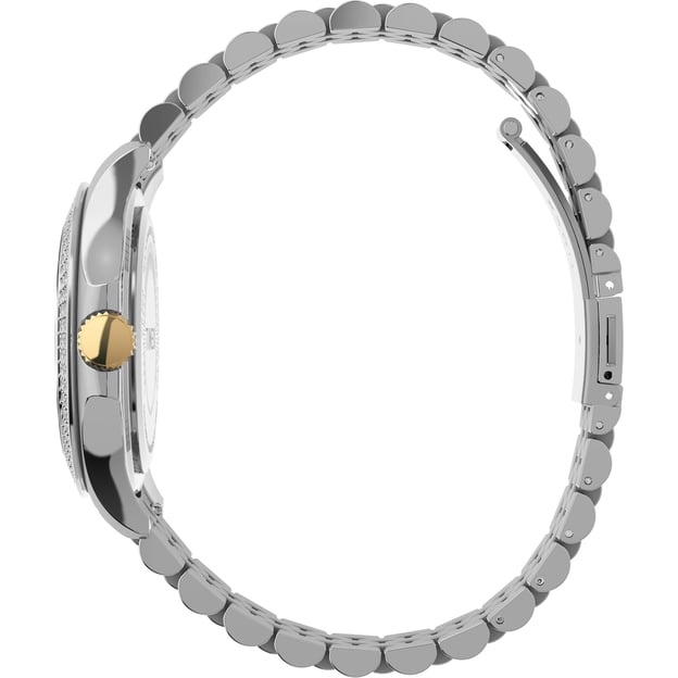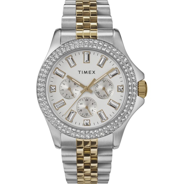 Жіночий мультизадачний годинник Timex KAIA Multifunction Tx2v79500 - модний та стильний годинник на сріблясто-золотистому сталевому браслеті з інкрустацією камінчиками на циферблаті та безелі. Багатофункціональна модель з трьома додатковими циферблатами: дата, день тижня, час у 24-годинному форматі. Завдяки декору цей годинник стане вашою улюбленою прикрасою. Дуже жіночна модель, але з більшим силуетом, ніж більшість жіночих годинників. Зухвалі та гламурні модниці, годинник KAIA створений для вас і чекає на момент, коли ви разом вирушите підкорювати чергові висоти.