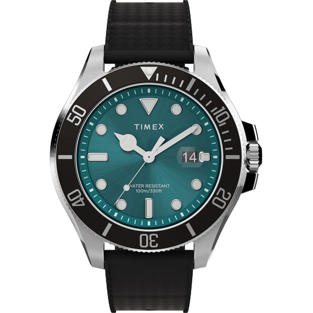 Чоловічий кварцовий годинник Timex HARBORSIDE Coast Tx2v91700 - модель з обертовим безелем на чорному ремінці із синтетичного каучуку. Спортивна модель з великою індикацією та обертовим безелем в стилі дайверських годинників. Завдяки водонепроникності 100 метрів ви можете впевнено носити його за будь-якої погоди.
