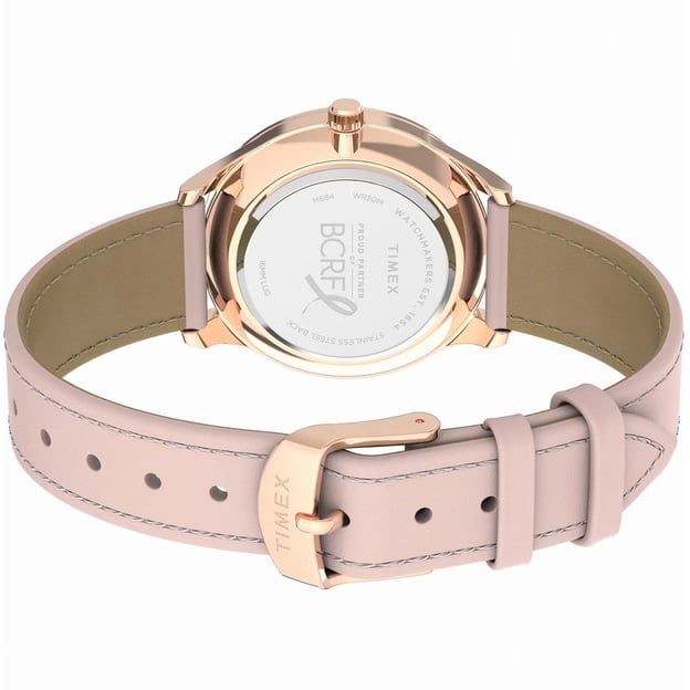 Кварцовий жіночий годинник Timex TRANSCEND Х BCRF Tx2v95700 в романтичному ніжно-рожевому дизайні зі шкіряним ремінцем і кольоровими камінчиками. Модель має акуратний корпус 32 мм, витонченість якого вдало підкреслюють стрази. У поєднанні з милим ремінцем це ідеальний годинник для романтичних натур. Годинник створено у колаборації з Фондом дослідження раку молочної залози, щоб привернути увагу та зібрати гроші для підтримки досліджень у галузі запобігання та лікування цього захворювання.