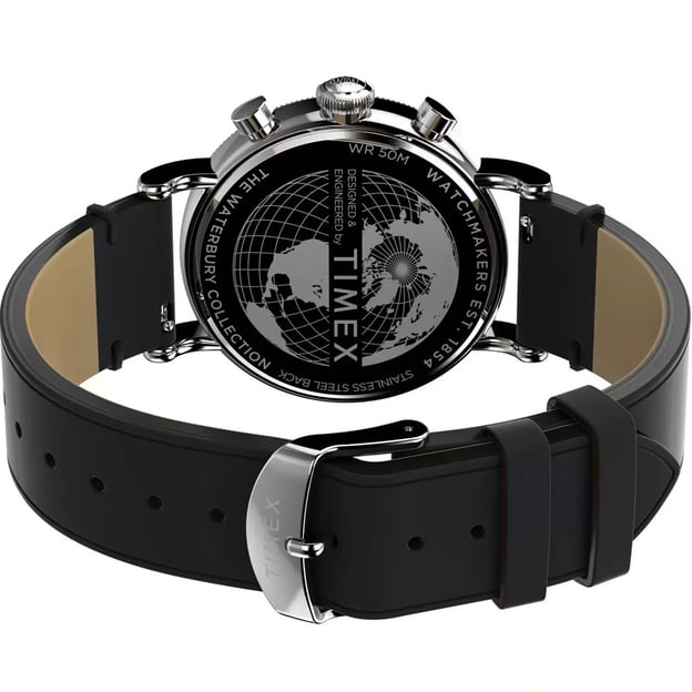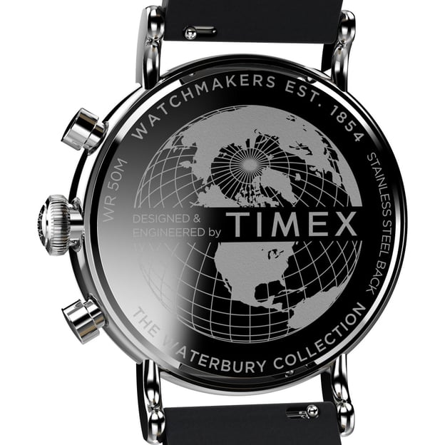 Timex WATERBURY Tx2w20600 - чоловічий кварцовий годинник-хронограф з нотками вінтажності. Модернізовані деталі з архівних дизайнів. Вірність класиці та використання автентичних елементів Timex, безліч несподіваних деталей, включаючи традиційне огранювання, що імітує стос монет на безелі, велику заводну головку та стилізовану букву W, що прикрашає циферблат, та яскраво виражену годинну стрілку. Годинник з хронографом забезпечує додаткову функціональність аналогового секундоміра. Використовуючи дві кнопки на корпусі, ви можете запустити, зупинити і скинути цю функцію. Три робочих циферблата: 1 – шкала у форматі 24 години; 2 – секундна стрілка; 3 – лічильник на 30 хвилин.
