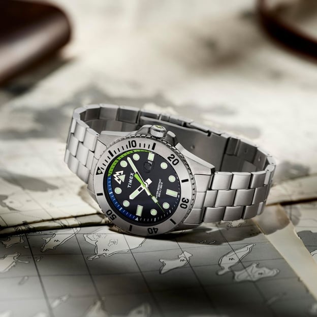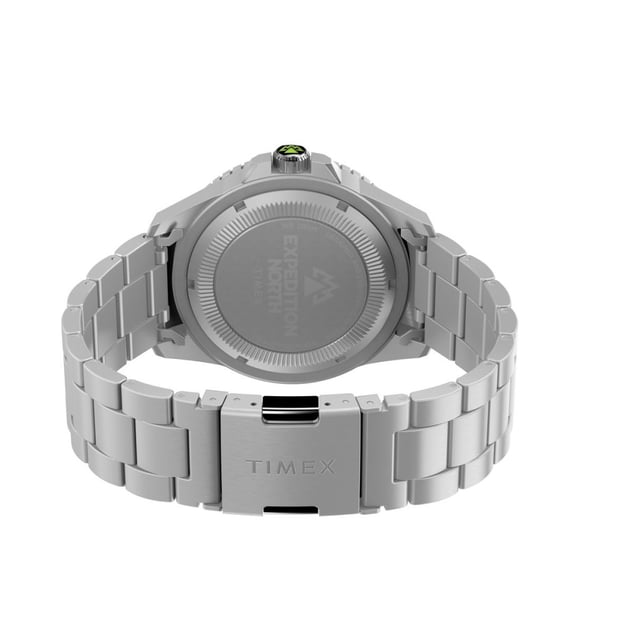 Годинник Timex EXPEDITION North Anchorage – це нове доповнення до серії Expedition North, яке поєднує витривалість і функціональність у корпусі з нержавної сталі. Модель створена в автентичному стилі дайверських годинників: великий чорний циферблат із люмінесцентними стрілками та мітками забезпечує чудову читабельність навіть у темряві, а яскраві сині та салатові акценти додають енергійності дизайну. Сапфірове скло з антибліковим покриттям та збільшувальною лінзою над апертурою дати гарантує максимальну прозорість і захист від подряпин. Односпрямований сталевий безель із храповим механізмом виконує роль аналогового таймера, що робить годинник практичним інструментом для занурень.