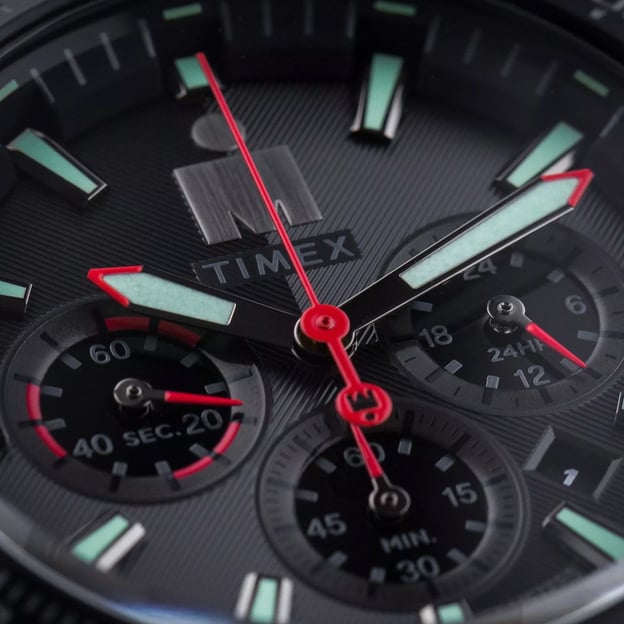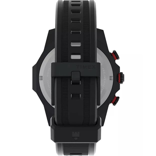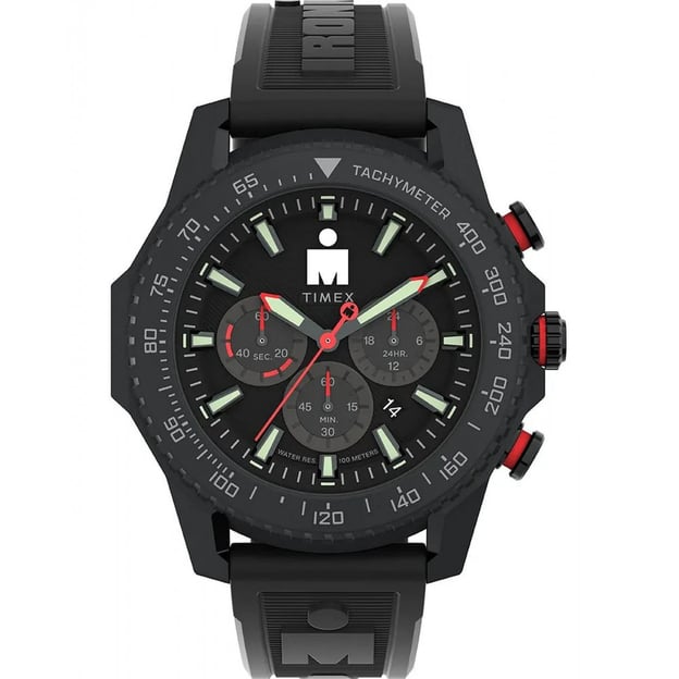 Timex IRONMAN Adrenaline Pro Chrono Tx2w55400 чоловічий спортивний годинник з функцією хронографа в чорному кольорі. Дизайн з червоними акцентами та великий сталевий корпус додасть впевненості. Годинник з точним механізмом хронографа для вимірювання часу та трьома додатковими циферблатами: формат 24 години; секундомір на 30 хвилин та секундна стрілка хронографа. Стильні люмінесцентні стрілки та мітки світяться у темряві. Модель має високий клас водозахисту 100 метрів (в годиннику можна плавати).