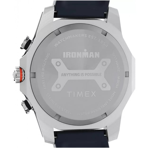 Timex IRONMAN Adrenaline Pro Chrono Tx2w55500 чоловічий спортивний годинник з функцією хронографа та темно-синім ремінцем. Дизайн з червоними акцентами та великий сталевий корпус додасть впевненості. Годинник з точним механізмом хронографа для вимірювання часу та трьома додатковими циферблатами: формат 24 години; секундомір на 30 хвилин та секундна стрілка хронографа. Стильні люмінесцентні стрілки та мітки світяться у темряві. Модель має високий клас водозахисту 100 метрів (в годиннику можна плавати).