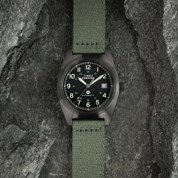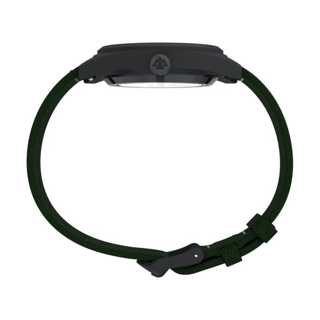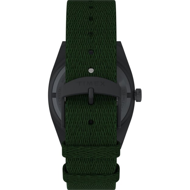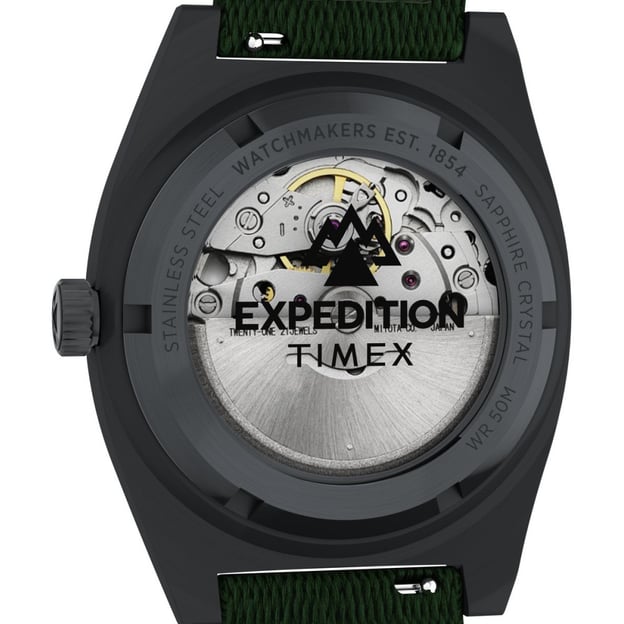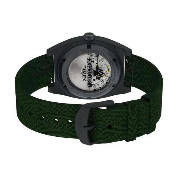 Чоловічий автоматичний годинник Timex EXPEDITION Field Post Automatic із чорним сталевим корпусом та зеленим текстильним ремінцем. Модель із серії Expedition Capstone вирізняється новим корпусом бочкоподібної форми з матової сталі та поєднує міцність із сучасним польовим стилем. Автоматичний механізм із 21 каменем працює без батарейки — він заводиться природними рухами вашого зап’ястка під час носіння. Задня кришка корпусу оснащена прозорим віконцем із загартованого скла, що дозволяє спостерігати за роботою механізму. Ремінець виготовлений із переробленого пластику, що підкреслює прагнення бренду до екологічності. Завдяки швидкознімним штифтам його можна легко замінити без інструментів.
