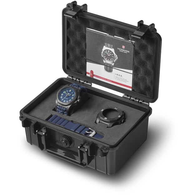 Victorinox V241860 - швейцарський карбоновий годинник I.N.O.X. Carbon з двома синіми ремінцями (паракордовий та гумовий). INOX Carbon, натхненний армією, - це годинник, який втілює силу воїна і продуманий дизайн. Цифри, логотип і стрілки покриті світлонакопичувальною речовиною Super-LumiNova®, яка забезпечує тривалу видимість у темряві. Корпус виготовлено з вуглецевого композиту, який використовується для захисту космічних шатлів від неймовірних температур під час входження в атмосферу.
