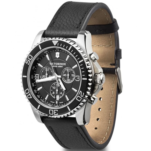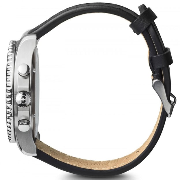 Victorinox MAVERICK Chrono V241864 - сталевий кварцовий годинник 43 мм з хронографом, датою та тахіметром на чорному шкіряному ремінці. Цей водонепроникний годинник залишається вірним морській стихії: має спортивний силует в стилі дайверських годинників, чудово адаптується до повсякденних викликів. А завдяки шкіряному ремінцю набуває одночасно й класичних рис. Мужній розмір сталевого корпусу та високий рівень водозахисту, з яким ви можете спокійно проводити дозвілля біля води. Точний швейцарський механізм із функцією хронографа. Швидке управління хронографом покладено на дві кнопки на корпусі: верхня - запуск/стоп стрілки хронографа; нижня – скидання значень.