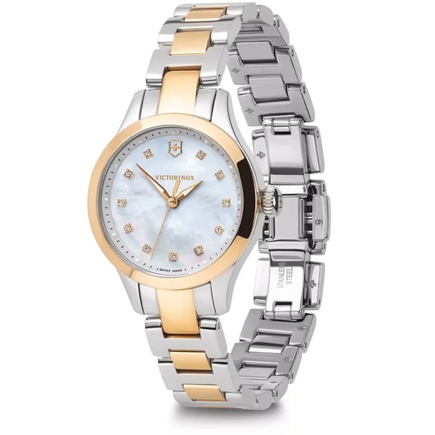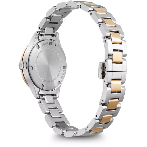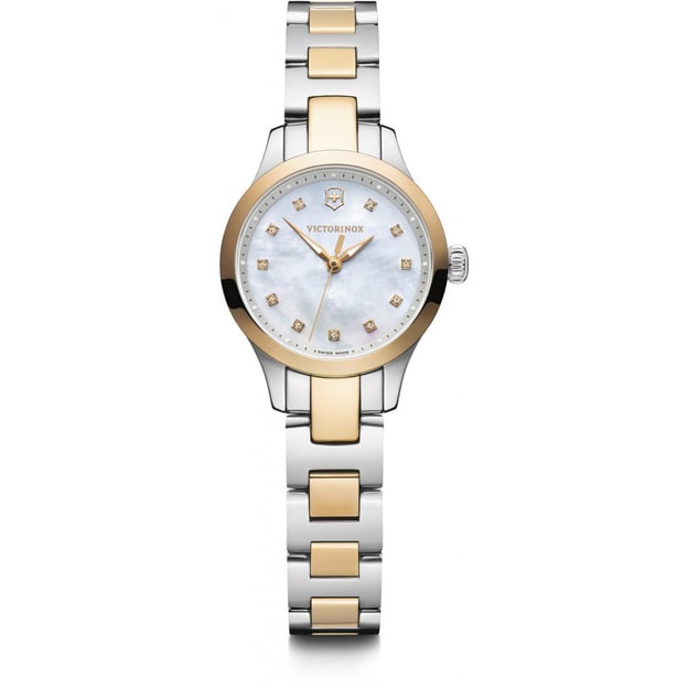 Victorinox Swiss Army Alliance XS 241877 — жіночий годинник 28 мм, де перламутровий циферблат і двоколірний браслет поєднані в елегантну та гармонійну композицію, яка підкреслює жіночність і витончений стиль. Невеликий корпус зручний на руці, а металевий браслет підкреслює вишуканість і стильність.