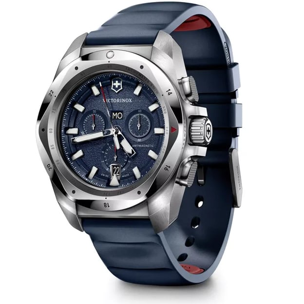Victorinox V241984 - швейцарський кварцовий годинник-хронограф I.N.O.X. Chrono на синьому гумовому ремінці. INOX Chrono продовжує захопливу еру годинників серії INOX моделями з хронографом. А додаткові функції тахіметра, дати та дня тижня допоможуть контролювати кожну секунду життя. Оновлені моделі так само мають фірмовий безель, який виглядає так, ніби його вирізали гострим ножем. Різьблені форми, суворі геометричні форми, зухвалий та мужній дизайн. Антимагнітний захист дозволяє уникнути неточностей часу через вплив електромагнітних хвиль. Сертифікований за стандартом ISO ударо- та водонепроникність. Корпус та безель на 60-70% складаються з переробленої неіржавної сталі. Victorinox гордо заявляють, що годинник розроблено, виготовлено і випробувано на їхньому власному заводі у Швейцарії.