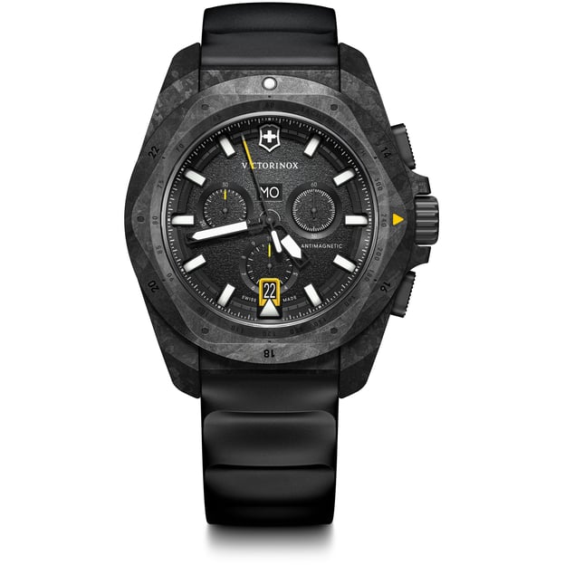 Victorinox V241989.1 - карбоновий годинник-хронограф I.N.O.X. Chrono з кварцовим механізмом і двома ремінцями. INOX Chrono продовжує захопливу нову еру годинників серії INOX моделями з хронографом. Поєднання міцності, інноваційності та комфорту в носінні завдяки використанню карбону, який характеризується міцністю, витривалістю, крутим зовнішнім виглядом і все це при набагато легшій вазі в порівнянні зі сталевими моделями. А додаткові функції тахіметра, дати та дня тижня допоможуть контролювати кожну секунду. Оновлені моделі так само володіють фірмовим безелем, який виглядає так, ніби його вирізали гострим ножем. Різьблені форми, строгі геометричні форми, зухвалий та мужній дизайн. Антимагнітний захист дозволяє уникнути неточностей часу через вплив електромагнітних хвиль. Сертифікований за стандартом ISO ударо- та водонепроникність. Victorinox гордо заявляють, що годинник розроблений, виготовлений і випробуваний на їхньому власному заводі у Швейцарії.