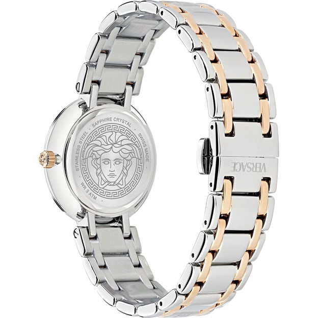 Жіночий годинник Versace Antlia VE0P00525 — це стримана класика з виразними деталями. Круглий корпус із неіржавної сталі у поєднанні сталевого та рожевого золота виглядає охайно й універсально, а сріблястий циферблат підкреслює чистий, світлий образ.
