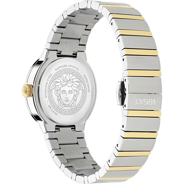 Versace Greca Logo Pearl VE0S00325 — елегантна жіноча модель з круглим корпусом і перламутровим циферблатом, який м’яко грає відтінками залежно від освітлення. Аналогова індикація виглядає прозоро й читабельно, а сапфірове скло додає відчуття акуратності та захищеності в щоденному носінні.