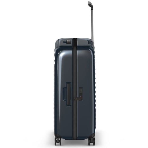 Victorinox Travel AIROX/Dark Blue L Велика (50 x 75 x 32 см / 98 л / темно-синя) - велика валіза на 4-х колесах з кодовим замком TSA для подорожей з великою кількістю речей. Валіза виготовлена з чистого полікарбонату. Ударостійкість полікарбонатного корпусу підтвердили численні тестування відповідно до стандартів швейцарського виробництва. Дві перегородки на блискавці надійно утримують речі на своїх місцях. При цьому забезпечують швидке та легке пакування завдяки інтелектуальній системі Butterfly (відкриваються назовні). Механізм закриття: багажна блискавка японського виробництва YKK - не боїться проколів і розривів. Її бігунки надійно фіксуються на кодовому TSA-замку. Великі 60-мм подвійні колеса забезпечують маневреність і позбавляють вас від потреби докладати зусилля під час транспортування.