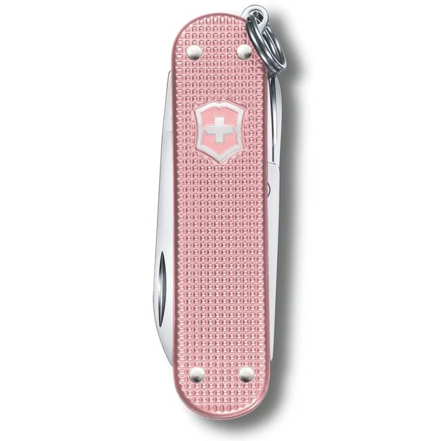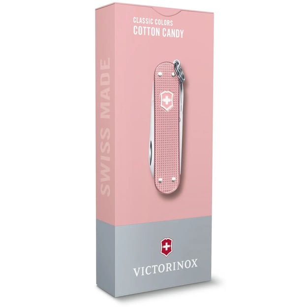 Victorinox CLASSIC SD Alox Colors 0.6221.252G - кишеньковий ніж із колекції Classic Colors 2021 року представлений у 30 різних кольорах. Стильний дизайн накладок у ніжно-рожевому кольорі Cotton Candy виконані із рифленого анодованого алюмінію і фірмовим логотипом, які надійно захищають від корозії і механічних пошкоджень. Завдяки цій обробці, руків'я стає більш стійким до впливу води та деформації. Рифлена поверхня забезпечує протиковзкий ефект, що робить ніж-брелок зручним і безпечним у використанні.