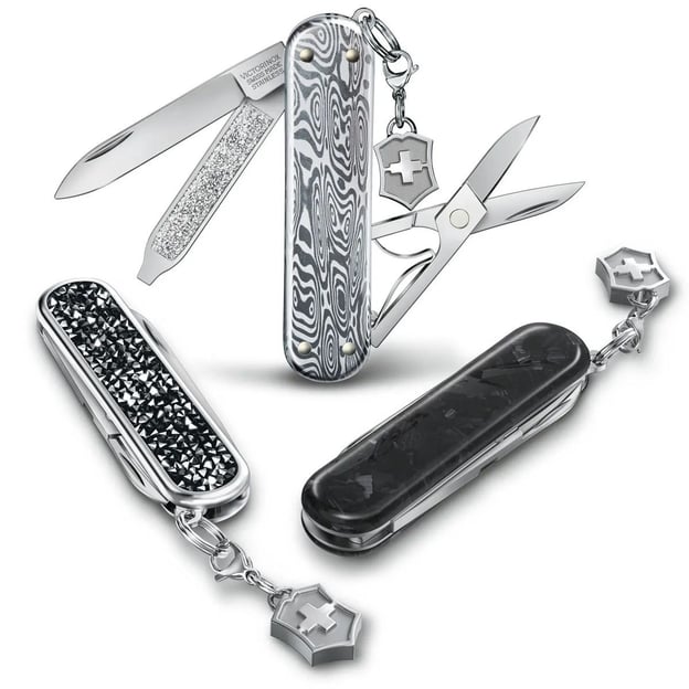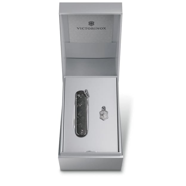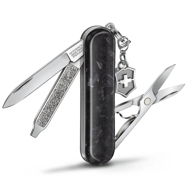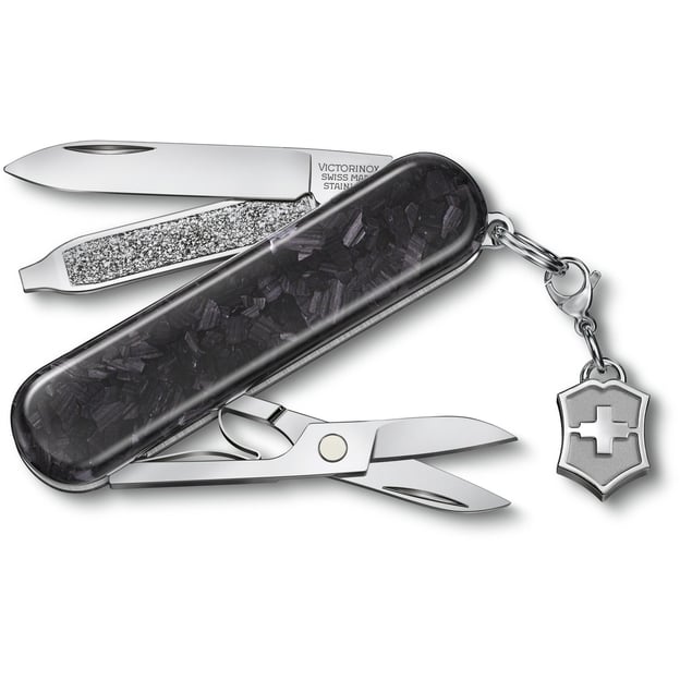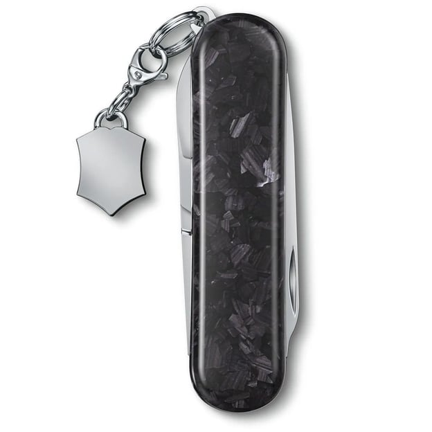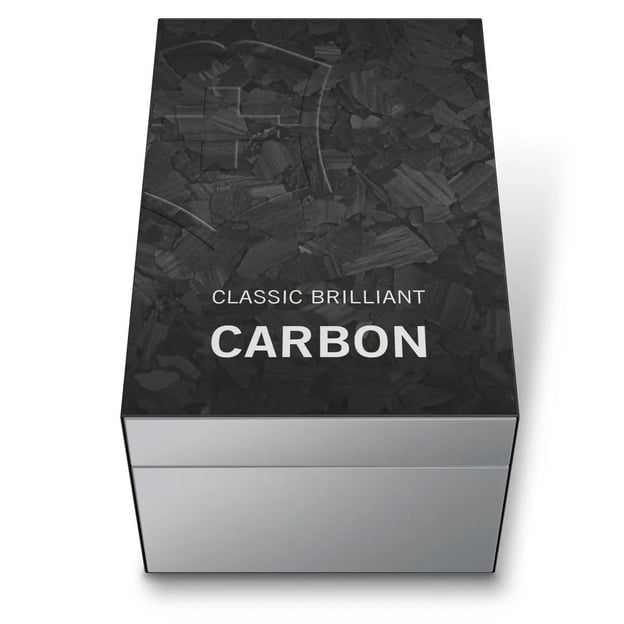 Victorinox CLASSIC SD Brilliant Carbon 0.6221.90 - швейцарський складаний ніж 58 мм з ексклюзивними чорними накладками з карбону. Преміальний дизайн із лінійки CLASSIC SD Brilliant, доповнений ще й знімним брелоком-логотипом. Ніж, пилочка, ножички і маленька викрутка - тому що не лише стилем та ефектними накладками вирішили підкорити нас Victorinox.