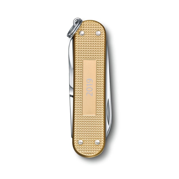 Victorinox CLASSIC Limited Edition 0.6221.L19 - це лімітована серія складного ножа, який відрізняється унікальним дизайном і високою якістю виготовлення. Цей мультитул є компактним і легким, ідеально підходить для повсякденних завдань. Корпус рукояті цього ножа виконаний з алюмінію Alox з унікальним рифленим дизайном і стійким анодованим оксидним покриттям, що забезпечує захист від корозії. Модель Classic Alox представлена в золотистому відтінку і прикрашена логотипом Victorinox з одного боку, а також зазначенням року колекції з іншого.