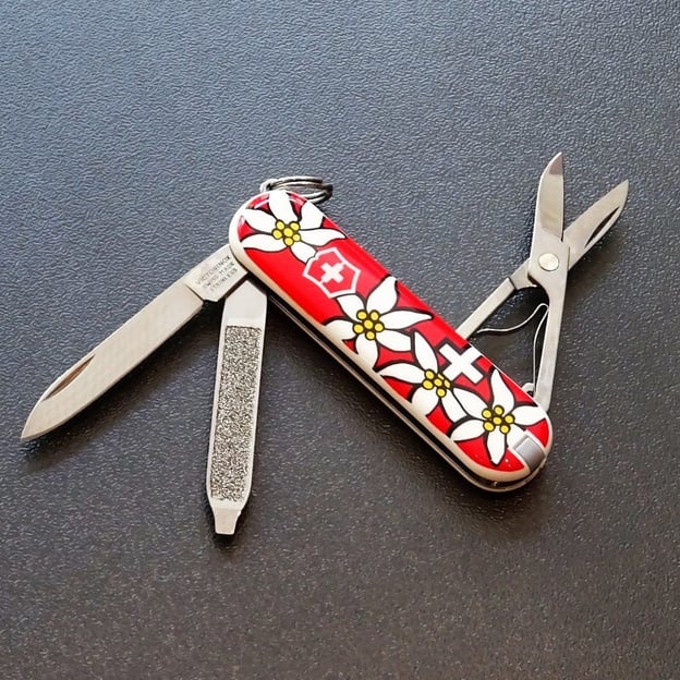 Victorinox CLASSIC SD 0.6223.840 - кишеньковий ніж завдовжки 58 мм на 7 функцій, виконаний з унікальним дизайном глянцевих накладок. Ця модель може бути особливо приваблива для жінок, завдяки едельвейсам на червоному тлі, а також фірмовим логотипом Victorinox. Його компактний розмір і легка вага ідеально підходить для подорожей і активного способу життя, де важливо мати при собі корисний інструмент без зайвого обтяження. Високоякісні матеріали виробу гарантують довговічність і надійність у використанні. До набору входять: