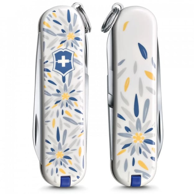 Victorinox CLASSIC Limited Edition 0.6223.L2109 - маленький ніж-брелок із лімітованої колекції 2021 року. Модні глянцеві накладки в дизайні Alpine Edelweiss прикрашені альпійськими едельвейсами з фірмовим логотипом. Легка вага і компактний розмір забезпечують зручність і мобільність у використанні. Усі інструменти ножа Victorinox виділяються своєю високою надійністю завдяки якісним матеріалам і ретельному виробничому процесу. Вони виготовлені з міцної неіржавної сталі, яка забезпечує довговічність і стійкість до корозії. Кишеньковий ножик оснащений різноманітними інструментами, які є універсальними та корисними в різних ситуаціях. До набору входять: